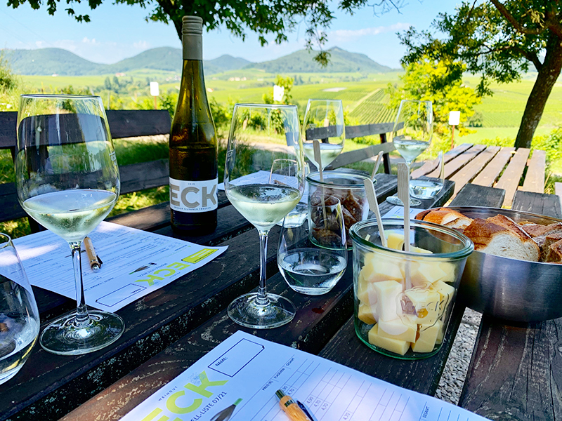 - Besprochene Weinprobe: Begrüßungssecco + 5 Weine + Mineralwasser + Brot (12,00 € pro Person)
